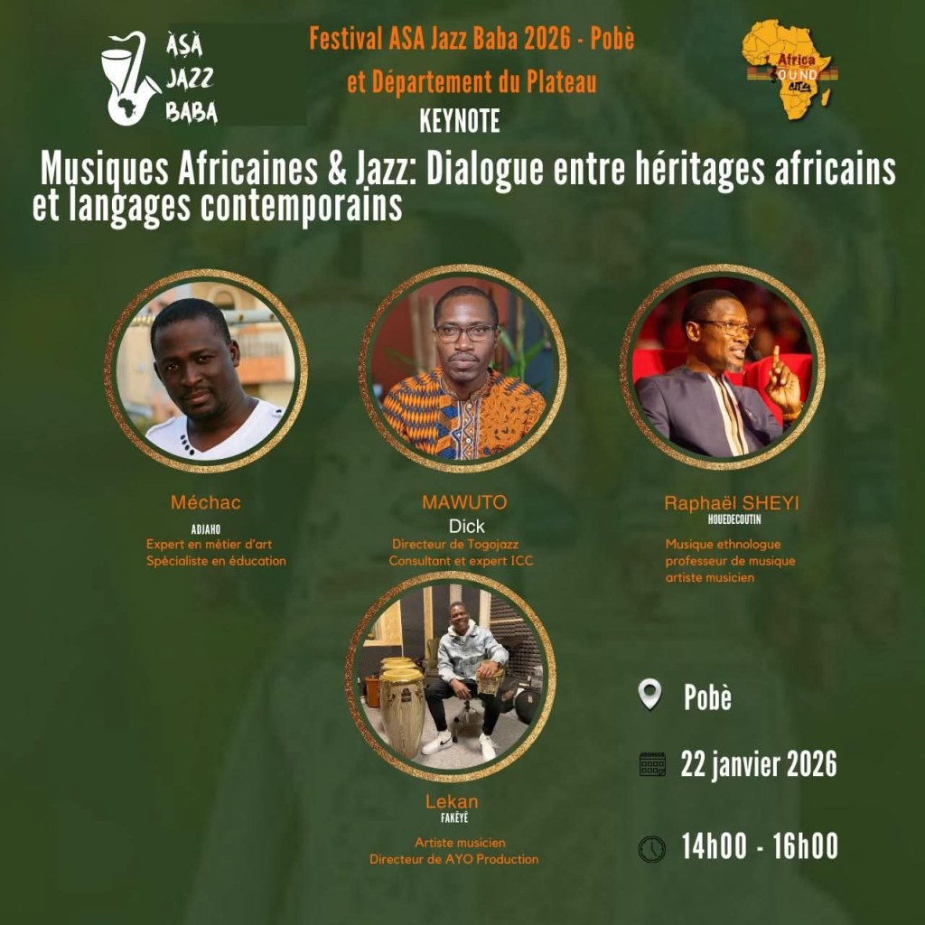 Cette journée sera prolongée par une keynote de référence sur le dialogue entre musiques africaines et jazz, animée par Mawuto Dick (fondateur du Togo Jazz Festival) et Raphaël Sheyi Houedécoutin, ethnomusicologue et professeur de musique, offrant une lecture historique et contemporaine des circulations musicales afro-diasporiques.